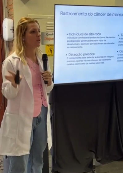 De forma leve e acolhedora, Dra. Eloisa Duzzi abordou temas relacionados à saúde feminina, enfatizando o autoconhecimento corporal e a importância dos exames preventivos, como a mamografia, além dos aspectos emocionais que envolvem o autocuidado.